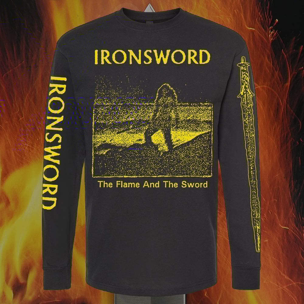 IRONSWORD "The Flame And The Sword" longsleeve shirts - tour leftovers at a special price! Super limited quantities - special vintage style yellow print on M & O brand LS shirts - size chart is on the last photo slide.