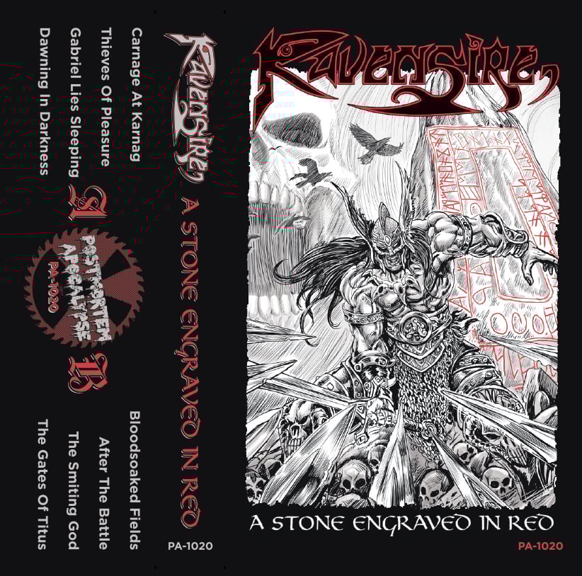 Ravensire's third album "A Stone Engraved In Red" is presented here on a deluxe limited edition cassette. One of Portugal's finest entities in the Epic Heavy Metal game! Officially licensed from Cruz Del Sur music! 100 copies featuring a 6-panel card with all lyrics, exclusive layout, and a metallic gold tape to top it all off!